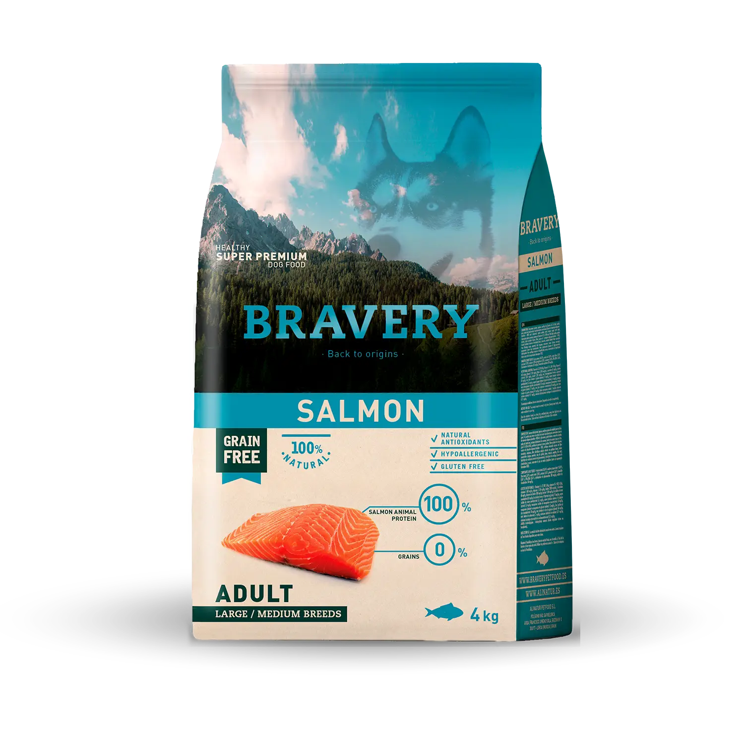 ADULT MEDIUM-LARGE SALMON ALIMENTO COMPLETO PARA PERROS Composición Salmón deshidratado, tapioca, grasa de ave (Fuente de ac. grasos Ω-6), guisantes, levadura y extracto de levadura-Saccharomyces cerevisiae (Fuente de mananooligosacáridos – MOS y β-glucanos), boniato, vaina de algarroba, pulpa de remolacha, proteína hidrolizada de salmón, aceite de salmón (Fuente de ac. grasos Ω-3-EPA y DHA), proteína de patata, Inulina (Fibra soluble de achicoria, fuente fosfooligosacáridos – FOS), celulosa natural (Fuente de fibra insoluble), minerales, fibra dietética soluble extraída de Plantago ovata, aceites esenciales (orégano, canela, clavo, tomillo, romero, hierbabuena, té verde), hidrolizado de crustáceos (Fuente de glucosamina), hidrolizado de cartílago (Fuente de condroitina), yuca, concentrado de zumo de melón liofilizado (Rico en superoxido dismutasa – SOD). Componentes analíticos Proteína bruta 26,00%, Grasa bruta 15,00%, Fibra bruta 2,50%, Ceniza bruta 7,90%, Calcio 1,60%, Fósforo 0,95%, Humedad 9,00%, EPA+DHA 0,56%, Glucosamina clorhidrato 380mg/kg, Condroitín sulfato 240mg/kg Aditivos Aditivos nutricionales: Vitamina A 22.000 U.I/kg.,Vitamina D-3 1.600 U.I/kg.,Vitamina E 460 mg/kg., Vitamina C 200 mg/kg., Biotina 2.000 mcg/kg., L-Carnitina 60 mg/kg, Cloruro de colina 1.800 mg/kg., Taurina 1.200 mg/Kg., Hierro (Sulfato ferroso monohidratado) 60 mg/kg., Hierro (Quelato ferroso de hidrato de glicina) 12 mg/kg, Cobre (Sulfato cúprico pentahidratado) 5,5 mg/kg., Cobre (Quelato cúprico de hidrato de glicina) 3,4 mg/kg., Manganeso (Sulfato manganoso monohidratado) 38 mg/kg., Manganeso (Quelato de manganeso de hidrato de glicina) 12 mg/kg., Zinc (Sulfato de zinc monohidratado) 76 mg/kg., Zinc (Quelato de zinc de hidrato de glicina) 46 mg/kg., Iodo (Yoduro de potasio) 2 mg/kg., Selenio (Selenito de sodio) 0,11 mg/kg., Selenio (Análogo hidroxilado de la selenometionina) 0,11 mg/kg. Aditivos tecnológicos: Antioxidantes naturales (Aceites vegetales ricos en tocoferoles).