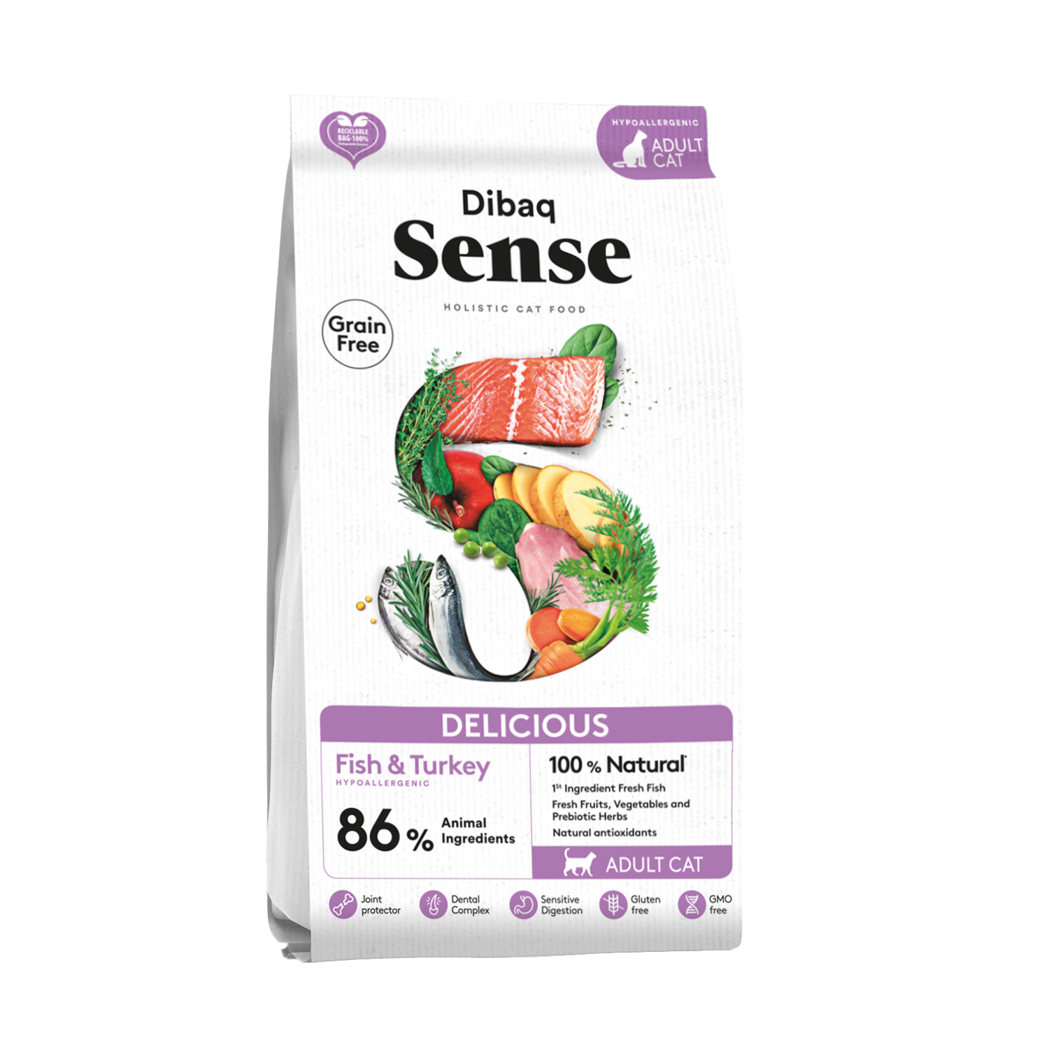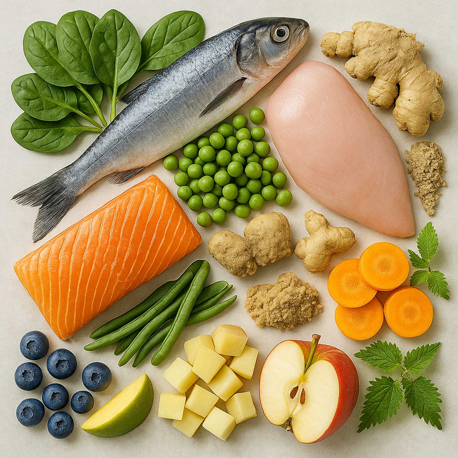 Pescado fresco 40% (salmón fresco 20%*, arenques frescos 20%*), pavo deshidratado 35%, guisantes pelados*, patata, aceite de pavo 10,5%, verduras y frutas frescas 4% (espinacas*, zanahoria* y manzana*), fibra vegetal, aceite de salmón 0,5% (fuente de ácidos grasos omega 3 y 6), extracto de malta, Ceratonia siliqua* , pulpa de remolacha, sustancias minerales, pack protector articular 0,1% (Condroitina sulfato, glucosamina clorhidrato y MSM), raíz de achicoria 0,05% (fuente de inulina-FOS), levaduras 0,05% (MOS), Complejo dental (Jengibre* y Ortiga*), yuca, L-carnitina.* Ingredientes naturales. . Proteína bruta 37%, Grasa bruta 18%, Fibra bruta 2,2%, Materia inorgánica 7,9%, Calcio 1,7%, Fósforo 1,3%, Sodio 0,35%, Vitamina A 21.000 UI/kg, Vitamina D3 2.100 UI/kg, Vitamina E (acetato de todo-rac-?-tocoferilo) 120 mg/kg, Energía metabolizable 3802 kcal/kg.