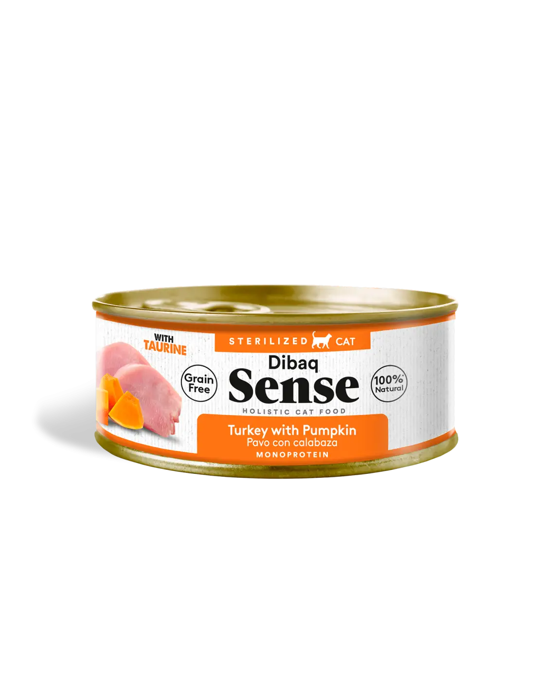 Alimento complementario hipoalergénico para gatos adultos y gatos esterilizados con carnes frescas de pavo, bacaladilla y calabaza. Receta sin gluten.