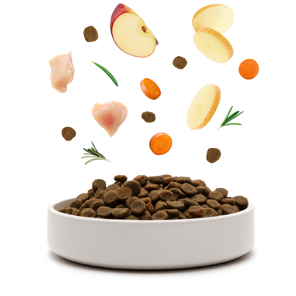 Carne fresca de cordero 33%, carne deshidratada de cordero 25%, guisantes pelados, patatas, aceite de pollo, pulpa de remolacha, hidrolizado de hígado de cordero, verduras y frutas frescas 4% (judías verdes y manzana), Ceratonia siliqua , aceite de salmón (fuente de ácidos grasos omega 3 y 6), sustancias minerales, pack protector articular (condrotina sulfato, glucosamina sulfato y MSM), yuca, raíz de achicoria (fuente de inulina-FOS), levaduras (MOS) y plantas aromáticas con propiedades antioxidantes naturales (romero, tomillo y orégano). Proteína bruta 28%, Aceites y grasas brutos 17%, Fibras brutas 2,2%, Materia inorgánica 5,9%, Vitamina A 17.000 U.I./kg, Vitamina D3 1.650 U.I./kg, Vitamina E (?-tocoferol) 112 mg/kg.