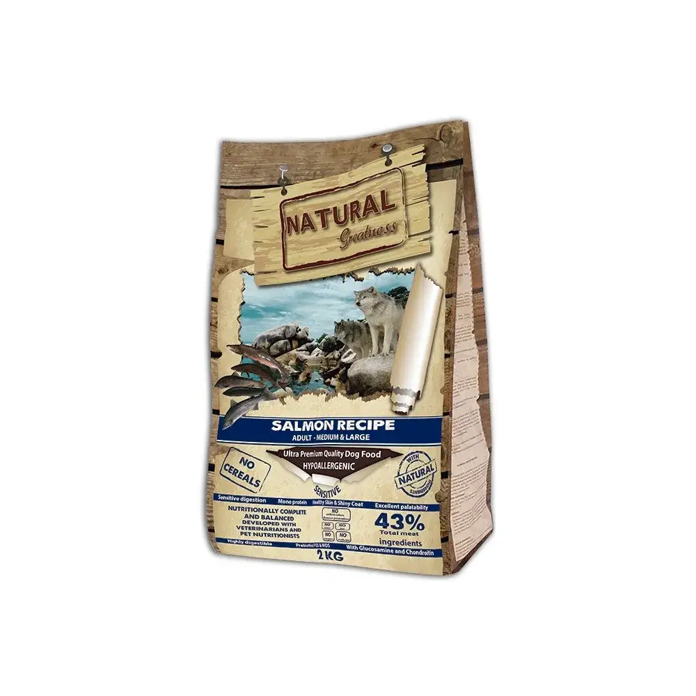 Natural Greatness RECETA DE SALMÓN es una excelente receta ultra premium, hipoalergénica y monoproteica formulada sin cereales diseñada para perros adultos de razas medianas y grandes con problemas en la piel o el pelaje. Esta receta posee una alta concentración de omega 3 y 6 que favorecen el sistema inmunitario y mejoran el tránsito intestinal. Todos los ingredientes de este alimento han sido seleccionados por su baja capacidad alergénica y su alto nivel de calidad, haciendo de ella el alimento ideal para perros con sensibilidad al pollo u otras carnes.
