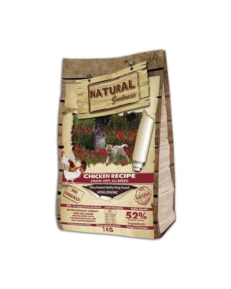 Natural Greatness RECETA DE POLLO es una excelente receta ultra premium e hipoalergénica formulada sin cereales diseñada para cachorros desde el destete hasta la edad de 12-18 meses, excelente también para hembras gestantes, en lactancia y adultos de razas pequeñas y medianas. Sus ingredientes favorecen el desarrollo muscular y proporcionan energía para el correcto crecimiento y desarrollo del cachorro. Toda nuestra alimentación se elabora siguiendo un proceso natural de cocción altamente avanzado que se basa en la inyección directa de carne fresca. La calidad de los ingredientes naturales empleados en nuestras recetas les aporta altos niveles de palatabilidad y digestibilidad.